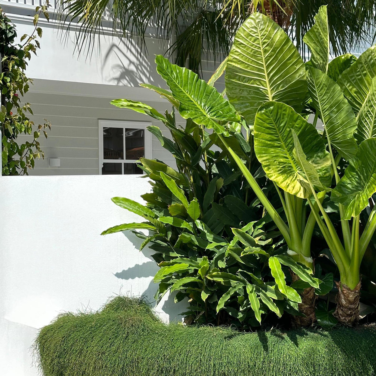 Alocasia macrorrhizos, known as Giant Taro, flaunts lush green foliage with large leaves in front of a white building and window, turning the scene into a tropical paradise under a sunny sky.-Nursery Near Me