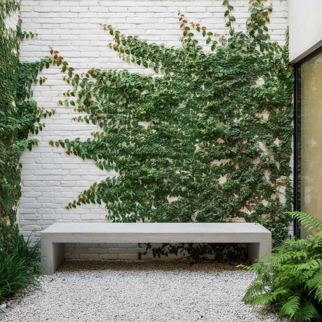 A concrete bench graces a garden where fast-growing Climbing Fig - Ficus pumila adorns a white brick wall, its evergreen leaves contrasting beautifully with verdant vines and gravel ground.-Nursery Near Me