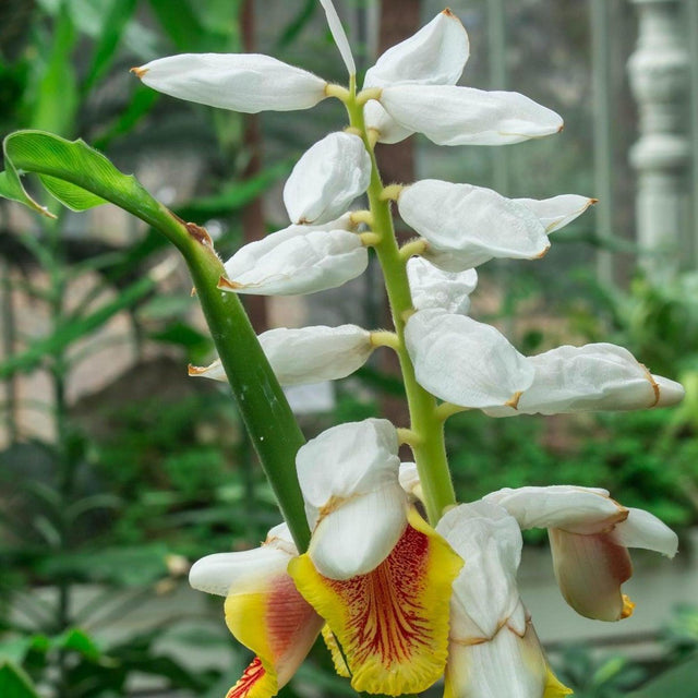 The lush False Cardamom (Alpinia nutans) features white tropical flowers with red and yellow centers on a green stem, ideal for a fragrant tropical hedge.-Nursery Near Me