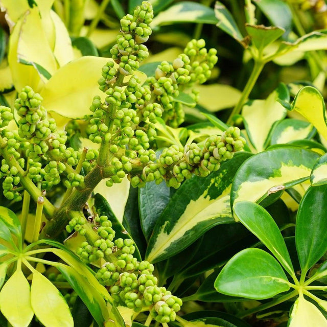 Close-up of green buds and shiny variegated leaves on a Madame De Smet Dwarf Umbrella Tree. As an adaptable indoor or outdoor plant, its vivid variegated foliage brings a lively touch to any space.-Nursery Near Me