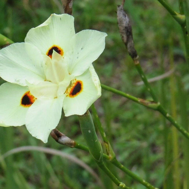 The Peacock Flower - Dietes bicolor is a drought-tolerant, cream-colored bloom with red-black spots, thriving amidst lush green foliage in outdoor settings, echoing its striking elegance.-Nursery Near Me