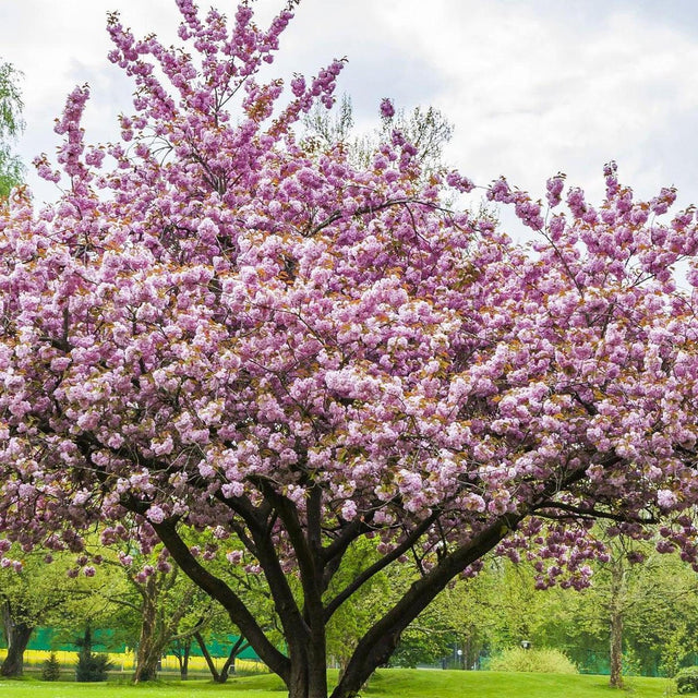 A Cheals Double Pink Weeping Cherry (Prunus serrulata Cheals Double Pink) adds charm to the park, its double pink blossoms vivid against a cloudy sky.-Nursery Near Me