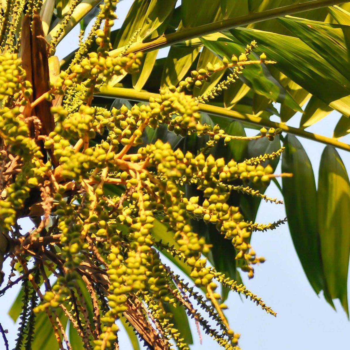 Close-up of vibrant Areca triandra fruits and spiky branches, set against large green leaves and a clear blue sky, providing an excellent privacy screening solution.-Nursery Near Me