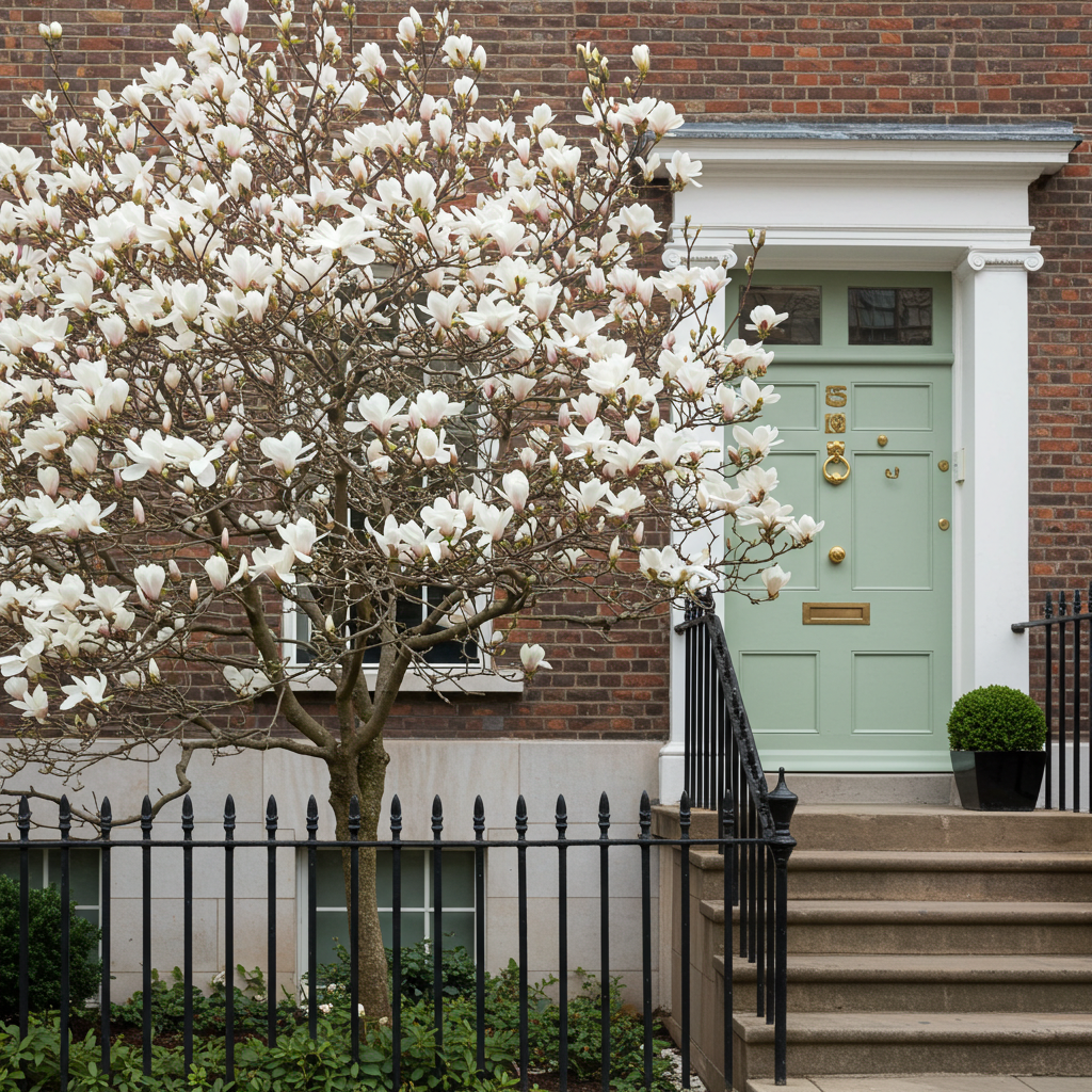 A brick house with a light green door and black railing stairs is adorned by early spring blooms of the Yulan Magnolia - Magnolia denudata Yulan, its fragrant flowers crafting a welcoming scene out front.-Nursery Near Me
